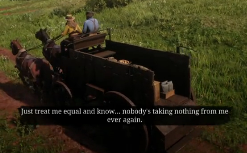 Arthur Morgan, the primary protagonist, is an ailing cowboy trying to navigate the decline of the wild west and the breaking up of his found family, Dutch's Gang. In the beginning, the gang saves a woman named Sadie Adler from a rival gang that murdered her husband and took over their cabin in the mountains. Sadie is understandably broken afterwards, struggling to talk to other gang members and often opting to be left alone. Eventually she begins working in the camp, contributing to what is often considered "woman's work" such as cooking or cleaning. Sadie clashes with the camp cook over him forcing the labor on her, finally throwing down her tools and screaming at him. She asks Arthur to take her with him into town, which he obliges. This leads to her reading a letter the camp cook asked them to post for him, in which he writes to his Aunt about how famous he is and how many suitors he has, laying his insecurities on the table for the player to see. This tangentially relates to the way Rip acts in The New Colossus, in which a man so concerned with ego and reputation as a man that they would lie and carve out a false narrative for themselves to feel better about their own personal insecurities. Of course, the camp cook's letter is far less consequential than what Rip does to Zofia and BJ.